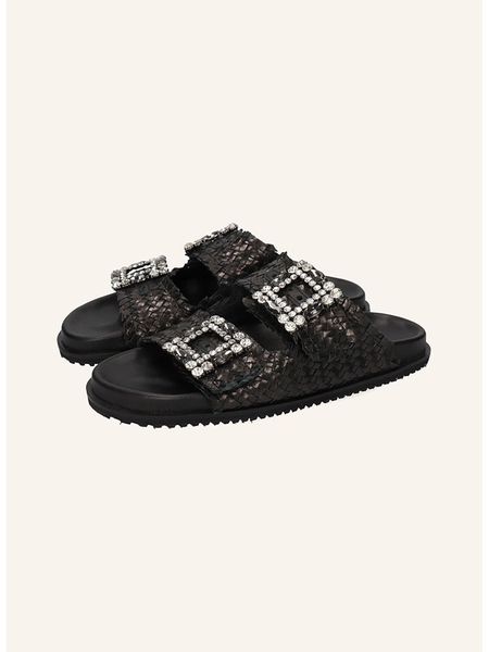 – zapięcie: sprzączka- noski: otwarte- powierzchnia: wzorzysta- detale: błyszczące kamyczki- podeszwa: lekko profilowana