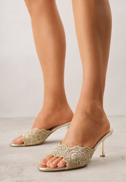Złote Klapki na Metalicznej Szpilce z Koronkową Cholewką Thyxyphise