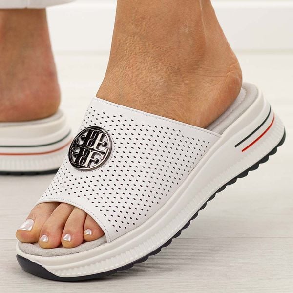 Klapki damskie S. Barski, skórzane licowe na grubej platformie, białe, LR51-661