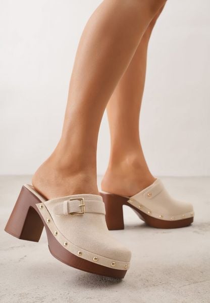 Beżowe Klapki na Słupku w Stylu Chodaków z Klamrami i Nitami Semelaia