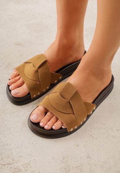 Brązowe Klapki z Przeplatanymi Paskami i Nitami przy Podeszwie Marivyn