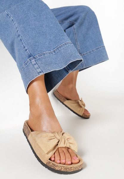 Klapki Danagale na płaskiej, grubej podeszwie z korka, z bieżnikiem. Wsuwane, z szerokim paskiem między palcami a śródstopiem. Ozdobione nonszalancko zawiązaną kokardą. Wykonane z ekozamszu. Klapki w odcieniu beżu świetnie uzupełnią stylizacje w każdym kolorze!