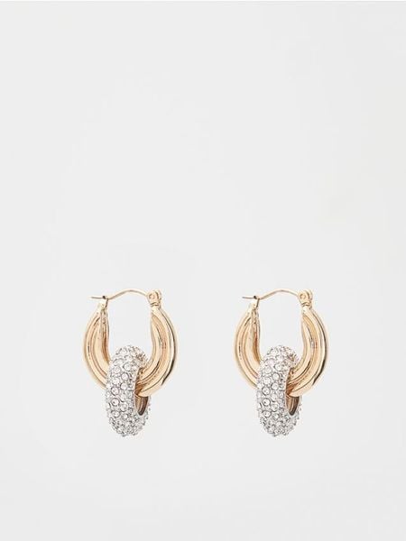 Kolczyki zdobione kryształkami, wykonane z łączonych materiałów w kolorach srebrnym i złotym.