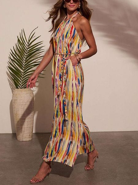 – ramiączka: na szyję- dekolt: okrągły- zapięcie: wiązanie na plecach- zdejmowany pasek: tkanina- kieszenie: wpuszczane- krój nogawek: Wide Leg- krój: luźny- wzór: na całościUwaga: Przy wyborze właściwego wariantu zaleca się korzystanie z tabeli rozmiarów.