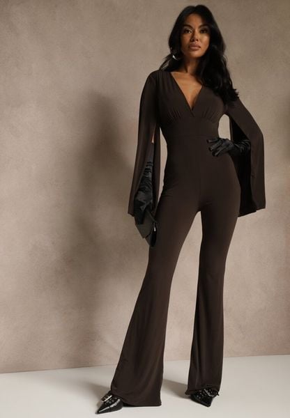 Brązowy Dopasowany Kombinezon z Rozkloszowanymi Rękawami i Głębokim Dekoltem Andrika