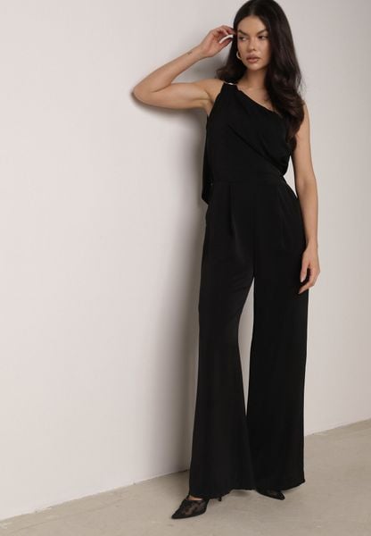 Czarny Elegancki Kombinezon o Asymetrycznym Kroju na Jedno Ramię z Klamrą Azerarax