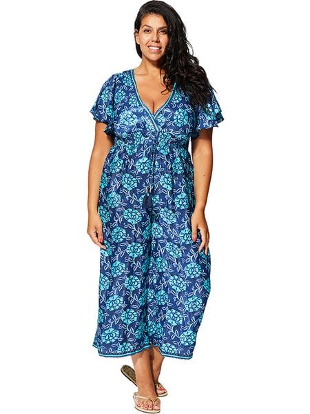 – dekolt: V- zapięcie: wiązanie na plecach- krój rękawów: motylek- talia: elastyczna- kieszenie: wpuszczane- długość nogawek: 7/8- krój: luźny- wzór: kwiatowy