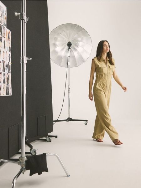 Kombinezon o prostym kroju, wykonany z tkaniny z wiskozą.