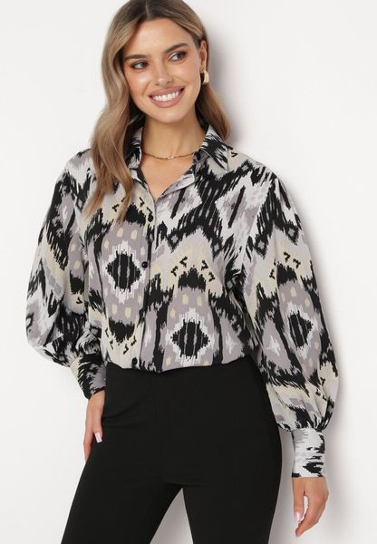 Beżowo-Czarna Koszula z Bufiastymi Rękawami w Etno Wzór Ithilwen
