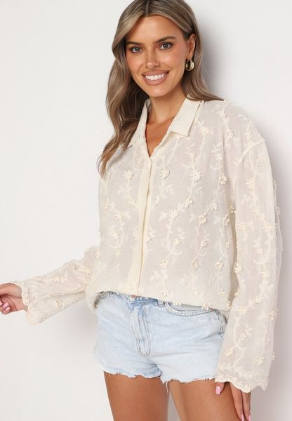 Beżowa Trapezowa Haftowana Koszula z Bawełną Elivna