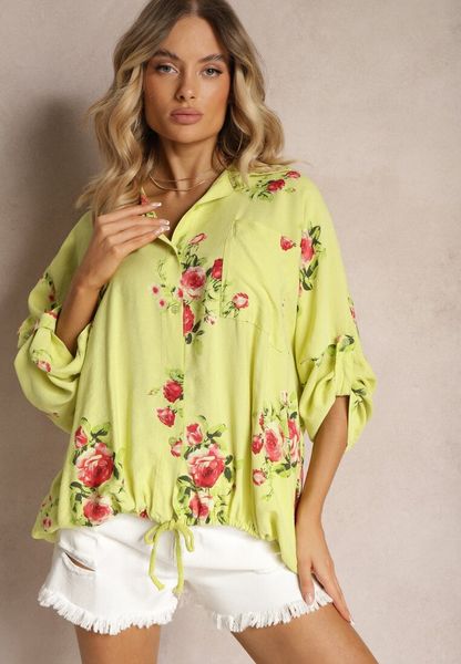 Zielona Wiskozowa Koszula Ściągana na Dole o Kwiatowym Wzorze Tinovis