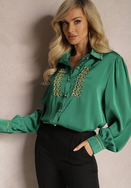 Zielona Satynowa Koszula z Kołnierzykiem Ozdobiona Cyrkoniami i Perełkami Classa