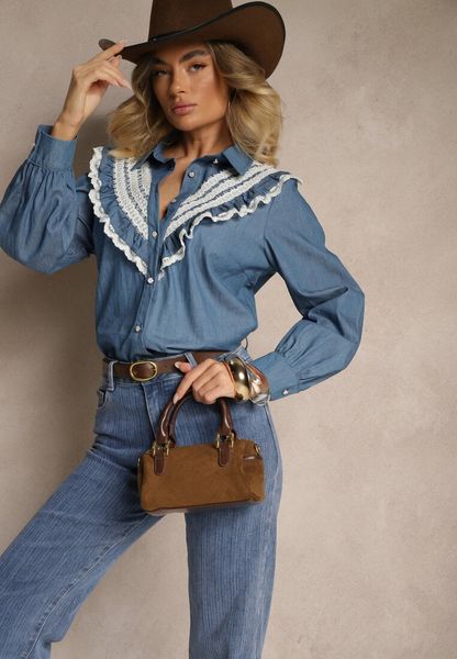 Niebieska Bawełniana Koszula w Rustykalnym Stylu z Koronką i Falbankami Lisalina