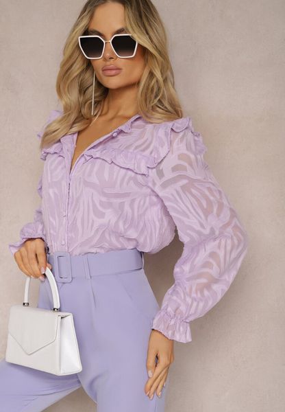 Fioletowa Koszula Lekko Przezroczysta z Falbankami i Abstrakcyjnym Wzorem Nusottia