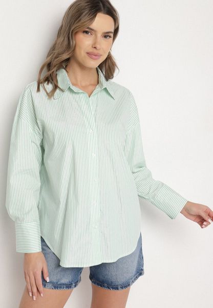 Zielona Bawełniana Koszula Oversize w Prążki Zdobiona Metaliczną Nicią Paserella