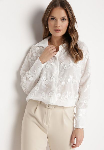 Biała Koszula Ozdobiona Haftami i Kwiatkami z Wysokim Mankietem Lirexia