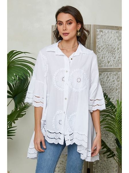 – czysta bawełna- kołnierz: kent- zapięcie: listwa guzikowa- detale: ozdobne bordiury- krój: luźny- wzór: na całościUwaga: Na metkach odzieży tej marki znajdują się rozmiary francuskie. Rozmiarówka została przez nas przeliczona. Podane do wyboru warianty rozmiarów odpowiadają standardowym europejskim rozmiarom konfekcji. Prosimy zapoznać się z zamieszczonym objaśnieniem rozmiarów.