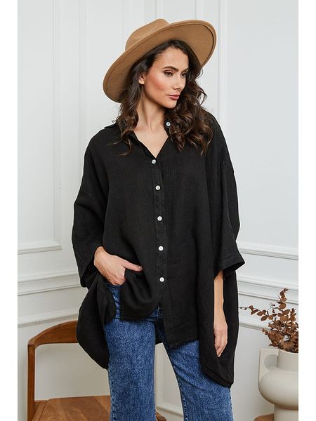 – czysty len- kołnierz: kent- zapięcie: listwa guzikowa- długość rękawa: 7/8- dolny brzeg: asymetryczny- krój: oversized- look: jednokolorowy