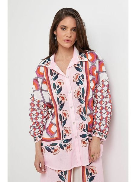 – czysty len- kołnierz: kent- zapięcie: listwa guzikowa- zakończenie rękawów: guzik- kieszenie: na piersi- dolny brzeg: zaokrąglony- krój: oversized- wzór: mix