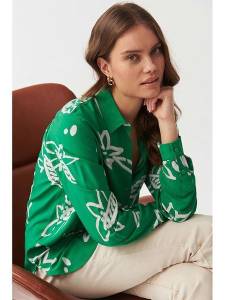 – czysta wiskoza- kołnierz: kent- zapięcie: listwa guzikowa- zakończenie rękawów: mankiet na guzik- dolny brzeg: zaokrąglony- krój: prosty- wzór: na całości