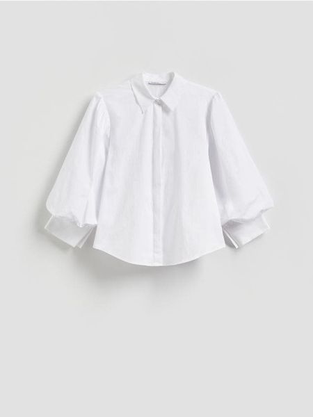 Koszula o swobodnym kroju, wykonana z tkaniny z bawełną.