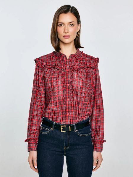 Koszula damska w kratę z ozdobnymi falbankami czerwona Frilo 000