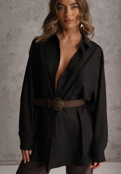 Czarna Bawełniano-Wiskozowa Koszula o Długim Kroju Oversize z Paskiem Tethys