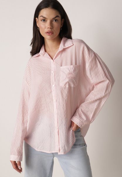 Różowa Koszula o Kroju Oversize z Tencelu w Paski Ozdobiona Haftem Tidine