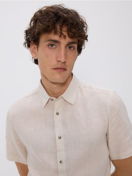 Koszula o dopasowanym kroju, wykonana z lnianej tkaniny.