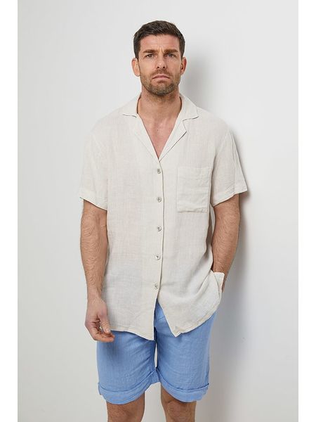 – czysty len- kołnierzyk: z klapami- dekolt: V- zapięcie: listwa guzikowa- długość rękawa: krótki- kieszenie: na piersi- dolny brzeg: z rozcięciem- krój: luźny- look: jednokolorowy