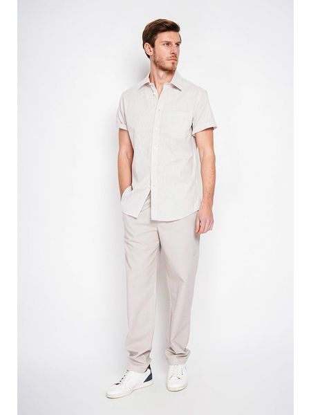 Lniana koszula męska ze stójką i kieszenią REGULAR FIT – jasnobrązowa V7 - Rozmiar: S