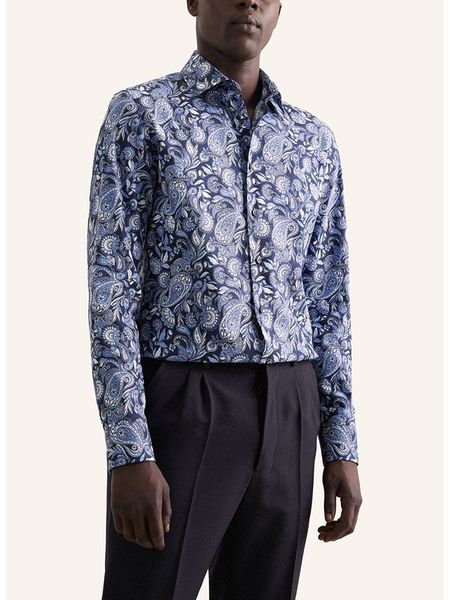 – czysta bawełna- kołnierz: kent- zapięcie: listwa guzikowa- zakończenie rękawów: mankiet na guzik- długość rękawa: długi- dolny brzeg: zaokrąglony- krój: wąski- wzór: orientalny