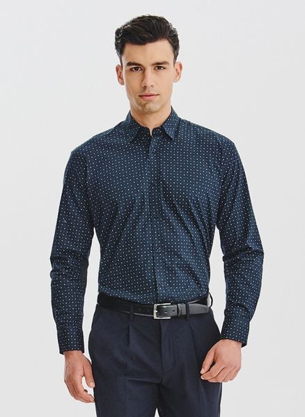 Granatowa koszula we wzory – Pako Lorente. Ciemna koszula na długi rękaw. Koszula w drobny bialy wzór geometryczny. Skład: 100% bawełna. Koszula Regular. Jesienna koszula męska.