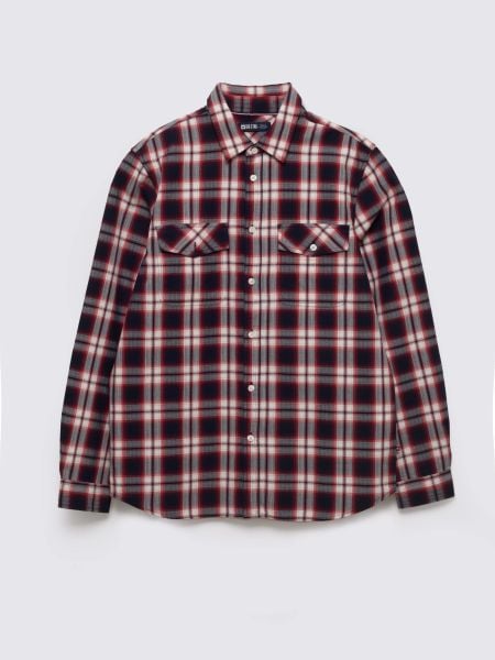 Czerwono-czarna koszula męska wykonana z miękkiej, oddychającej bawełny. Model zdobi klasyczna krata ze strukturą jodełki, która nadaje całości eleganckiego, a jednocześnie casualowego charakteru. Koszula posiada dwie praktyczne kieszonki z klapkami zapinanymi na guziki, klasyczny kołnierzyk oraz mankiety z możliwością regulacji obwodu. Z tyłu, na karczku, umieszczono subtelną blaszkę z logo, podkreślającą jakość wykonania.