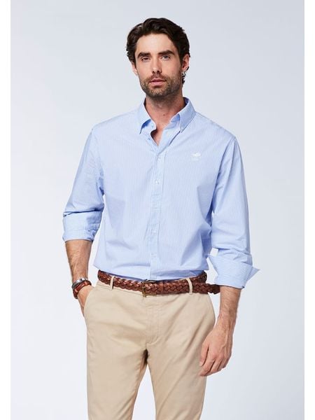 – czysta bawełna- kołnierz: button-down- zapięcie: listwa guzikowa- zakończenie rękawów: mankiet na guzik- fason: regular fit- krój: prosty- dolny brzeg: zaokrąglony- detale: haft z logo- wzór: paski