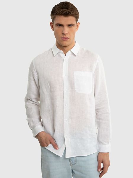 – czysty len- fason: regular fit- kołnierz: kent- zapięcie: listwa guzikowa- zakończenie rękawów: mankiet na guzik- kieszenie: na piersi- krój: prosty- look: jednokolorowy