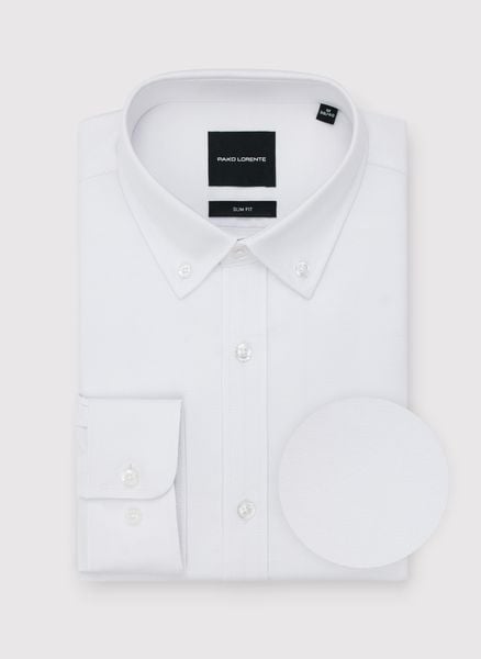 Biała koszula męska – Pako Lorente. Koszula z długim rękawem. Skład: 65% bawełna, 35% poliester. Fason Slim. Online Only. Kołnierzyk button down.