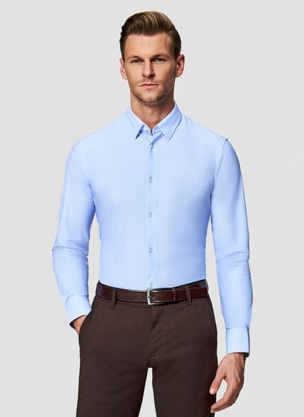 Niebieska koszula męska – Pako Lorente. Koszula w mikrowzór z długim rękawem. Jasna koszula z dzianiny. Skład: 76% poliamid, 24% elastan. Fason Slim. Kołnierzyk typu kent. TRAVELER.