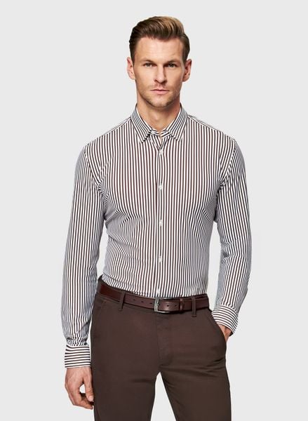 Koszula męska w prążek – Pako Lorente. Brązowa koszula w prążek z długim rękawem. Wiosenna koszula na guziki. Skład: 77% nylon, 23% elastan. TRAVELER. Fason: Slim.