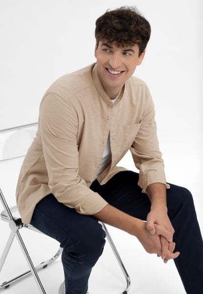 Lniana koszula męska ze stójką i kieszenią REGULAR FIT – jasnobrązowa V7