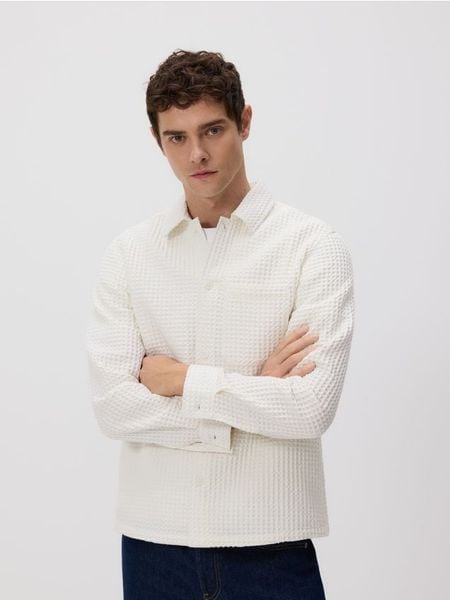 Koszula o swobodnym kroju, wykonana z tkaniny z bawełną.