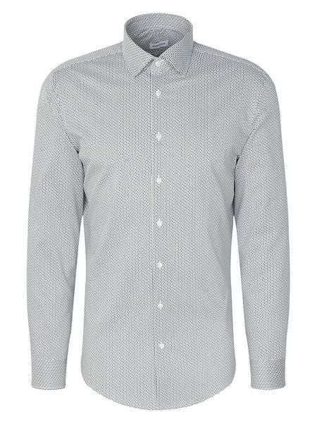 – z dodatkiem bawełny- fason: slim fit- kołnierz: kent- zapięcie: listwa guzikowa- długość rękawa: długi- zakończenie rękawów: mankiet na guzik- dolny brzeg: zaokrąglony- wzór: na całości