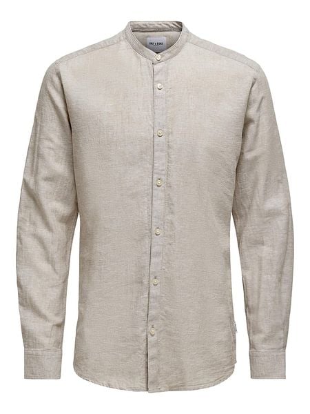 – z dodatkiem bawełny- z dodatkiem lnu- fason: regular fit- kołnierz: stójka- zapięcie: listwa guzikowa- zakończenie rękawów: mankiet na guzik- długość rękawa: długi- dolny brzeg: zaokrąglony- krój: prosty- look: jednokolorowy