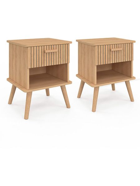 W zestawie:- 2 stoliki nocne- materiał: płyta wiórowa, drewno sosnowe- szuflady: 1- półki: 2- duża pojemność- funkcjonalny i dekoracyjny designUwaga: Oferta nie obejmuje widocznych na zdjęciu dekoracji.