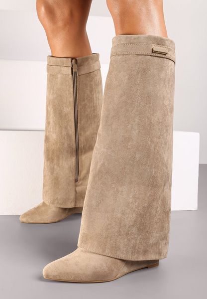 Ciemnobeżowe Kozaki na Koturnie z Wywiniętą Cholewką Alstina