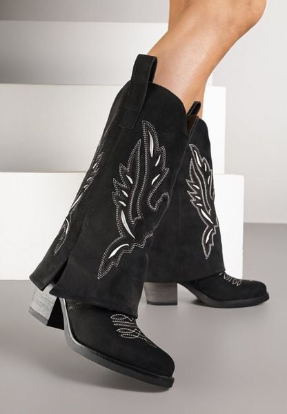 Czarne Kozaki Kowbojki na Obcasie z Wywiniętą Cholewką i Haftem Emmirine
