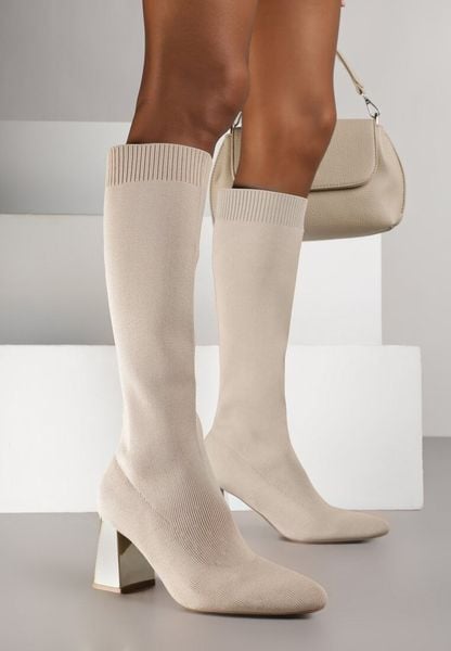 Ciemnobeżowe Eleganckie Kozaki VICES na Metalicznym Obcasie ze Skarpetkową Cholewką Nalaina