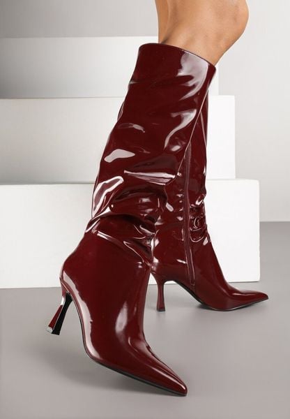 Bordowe Kozaki na Szpilce ze Szpiczastym Noskiem i Lakierowanym Połyskiem Nalireia