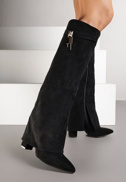 Czarne Kozaki na Słupku Ozdobione Metaliczną Kłódką i Wywiniętą Cholewką Lattorea