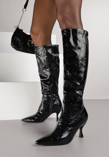 Czarne Marszczone Lakierowane Kozaki Vices na Szpilce z Noskiem w Szpic Caldissa